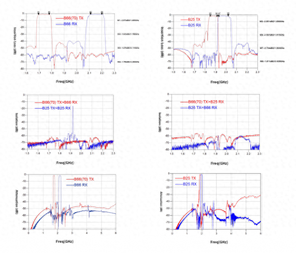 B25 TX带内插损典型值小于2.6dB,B25 RX带内插损典型值小于2.8dB,B25的接收和发射隔离度典型值分别达到58dB和56dB。