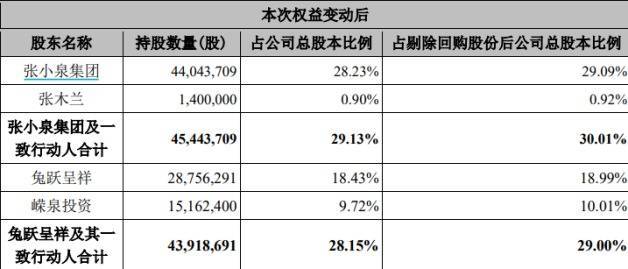 员工持股平台嵘泉投资的“倒戈”更凸显局势微妙。作为原张小泉集团的一致行动人,嵘泉投资在今年6月发生关键变动:新晋二股东兔跃呈祥以8467.55万元受让其34.30%的合伙份额,交易完成后,嵘泉投资的普通及执行事务合伙人由实控人张樟生变更为兔跃呈祥,正式成为兔跃呈祥控制的企业。由此,兔跃呈祥与其一致行动人嵘泉投资的合计持股比例升至28.15%,与张小泉集团及一致行动人张木兰29.13%的合计持股比例已近乎持平。