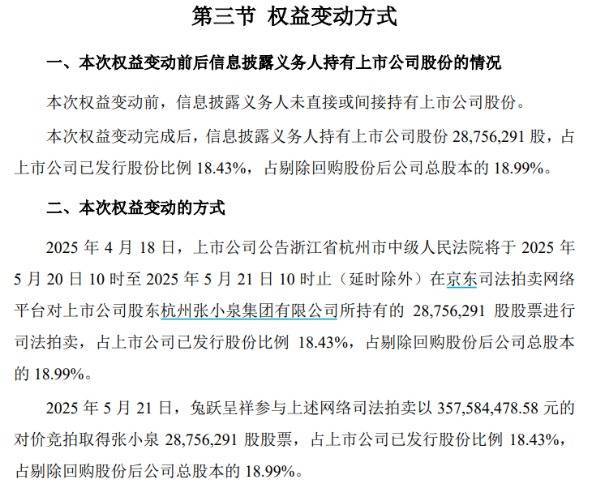 证券之星注意到,今年5月,张小泉集团所持上市公司的部分股份被先后两次司法拍卖,其中在今年5月21日,兔跃呈祥以3.58亿元的最高对价竞拍取得张小泉28756291股股票,对应持股比例18.43%。前述两笔股份过户完成后,张小泉集团的持股比例减少至28.23%,兔跃呈祥则一举晋升为张小泉第二大股东。
