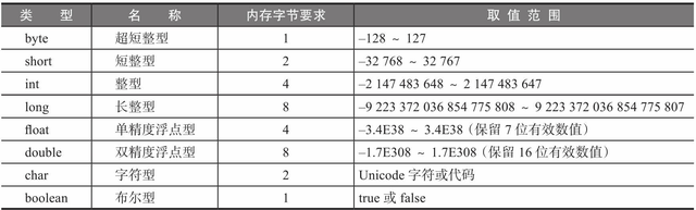 用来储存基本数据的变量称作基本变量。表2.4列出了Java的8种基本数据类型及其取值范围。