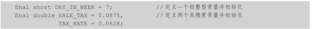 顾名思义,常量就是不变的量。常量也需要编译器分配存储空间,不过在这个存储器中的数据,一旦被存入,就不能再改变了。在Java中,用关键字final来表示所定义的是常量。常量在定义时必须同时赋予值,或者对其初始化。这也是Java的规定,否则便是语法错误。命名规范中要求常量用大写字母表示。下面是定义常量的典型例子: