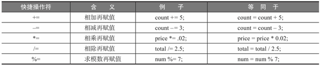 这里,varName是已经定义的变量名;value是该变量的一个合法数据值。试想:你可以总结一下其他快捷操作符的语法格式吗?