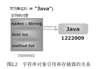 从图2.2中可以看出,当一个字符串被定义并赋值时,编译器将创建一个字符串对象,同时创建一个由这个字符串对象所引用的地址,这个地址是一段存储器空间的开始地址,这段存储空间的大小由具体的赋值内容来确定。例如: