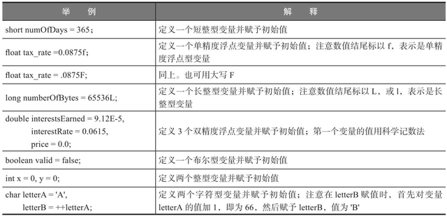 表2.5 定义变量和变量初始化例子