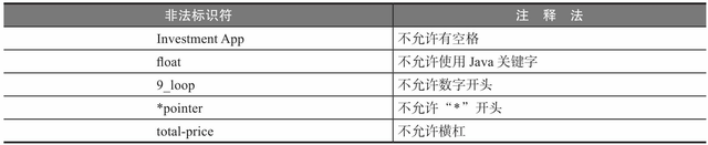 表2.3中列举了一些常见的非法标识符和出错的原因。