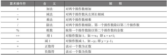 表2.6列出了Java语言的算术操作符及其含义。