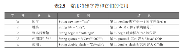 表2.9列出了特殊字符,或称转义符。使用它们时必须使用前缀斜线(\),告诉编译器后面的字符是特殊引用的字符。表中前3个字符是控制光标位置的操作。第4个字符为双引号的使用。由于双引号已经被用来表示引用字符串的内容,若在字符串里使用双引号作为其内容,必须在双引号前加“\”,即“\”。最后一个特殊字符是斜线“\”。由于斜线也被用来作为常量特殊字符的标示符,若要把它作为字符串的内容,必须在斜线前再加一个斜线,即“\\”。第一个斜线告诉编译器在它后面的字符才是真正引用的字符。
