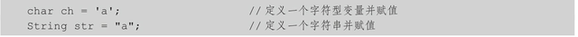 尽管它们的值相同,但这两个变量有着本质的不同。一个是基本字符型变量;而另一个是对字符串对象的直接引用,或简称为定义一个字符串变量并赋值。