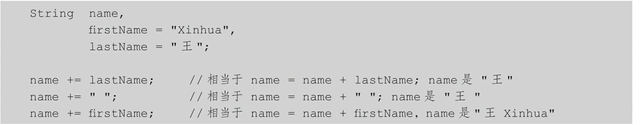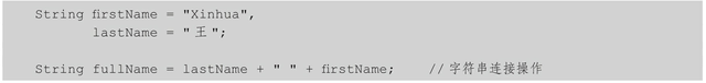 在连接后,字符串fullName的值是“王 Xinhua”。注意,名字中间的空格是由一个空格字符串常量" "加上去的。