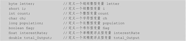 datatype variableName;dataType为8种数据类型之一,variableName必须是合法标识符,并要求遵守命名规范。例如: